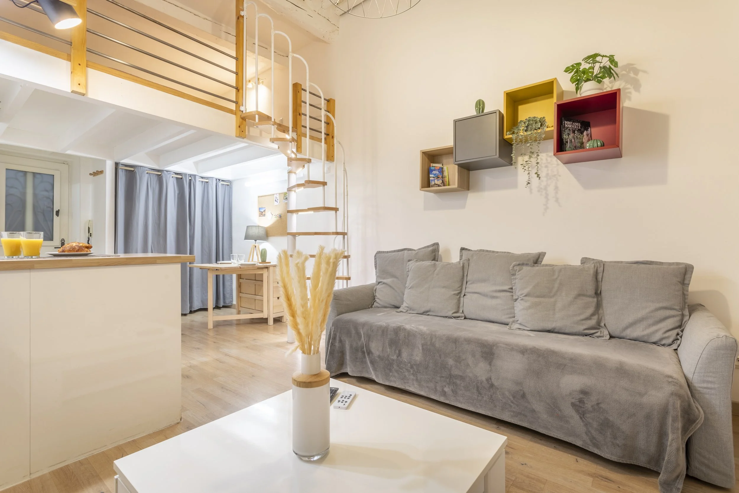 Situé au rez-de-chaussée d’un immeuble dont l’entrée se trouve en haut de la célèbre place des Cardeurs, ce studio de 35 m² Carrez avec mezzanine allie cachet et fonctionnalité.